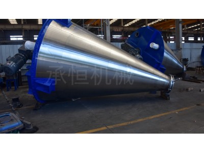 立式锥形螺带混合机由传动机构、锥形筒、外层螺带搅拌器、内层反向螺杆搅拌器和出料阀组成。物料在外层螺带搅拌器的作用下沿轴盘旋、提升,而内层反向螺杆搅拌器将物料沿轴盘旋、下推,完成均匀混合动作。